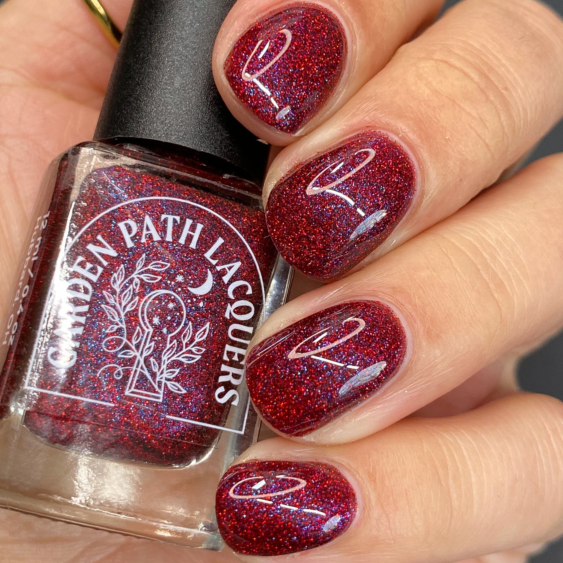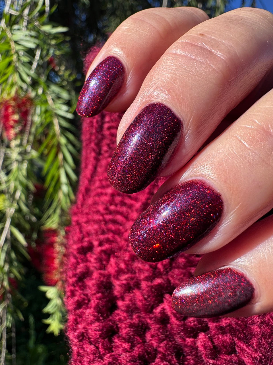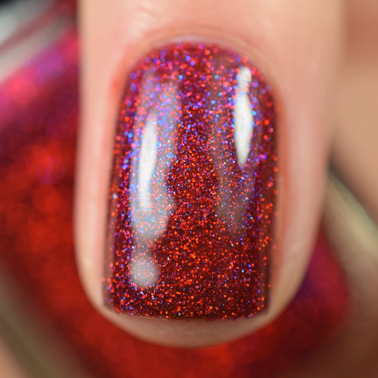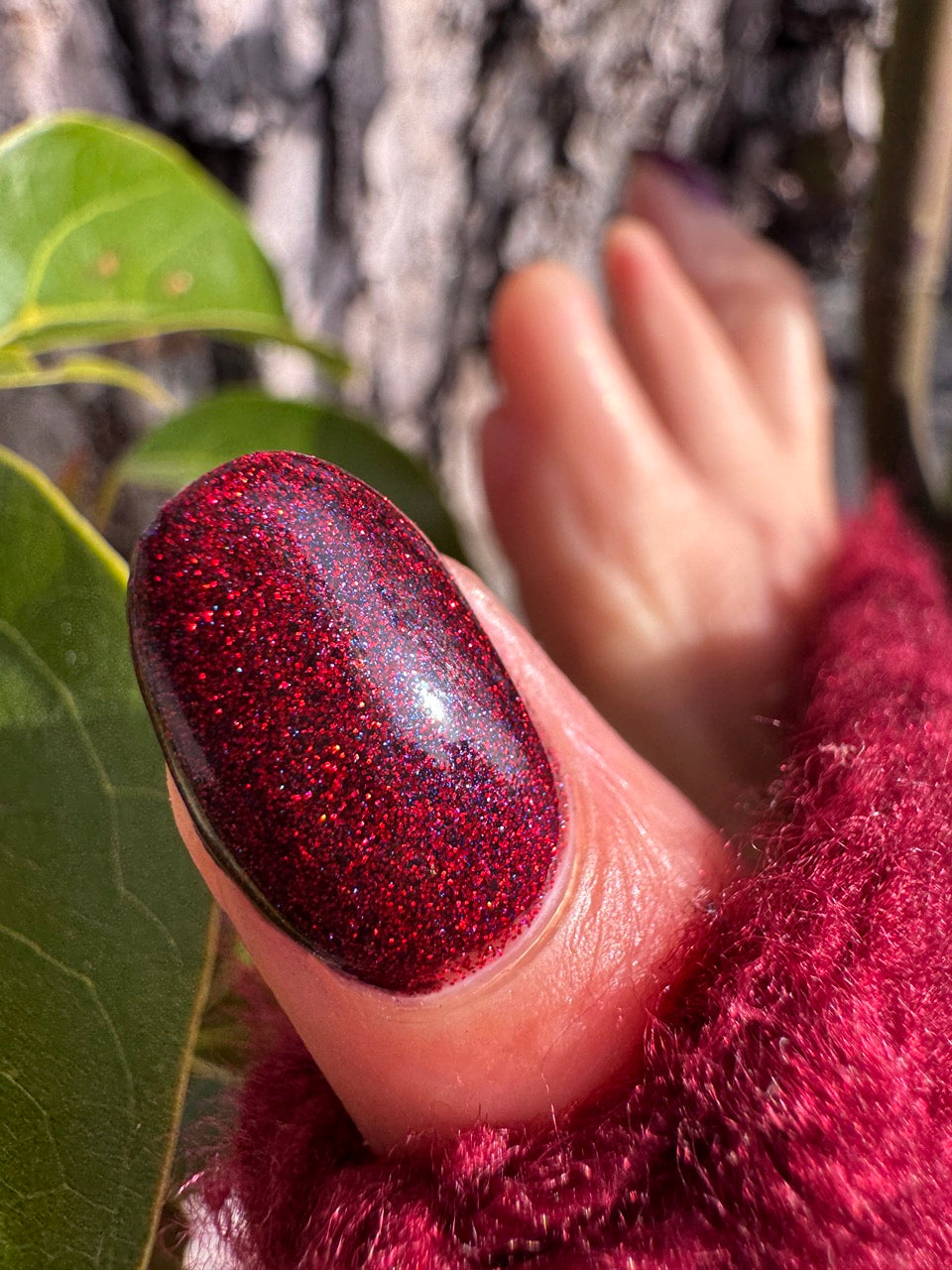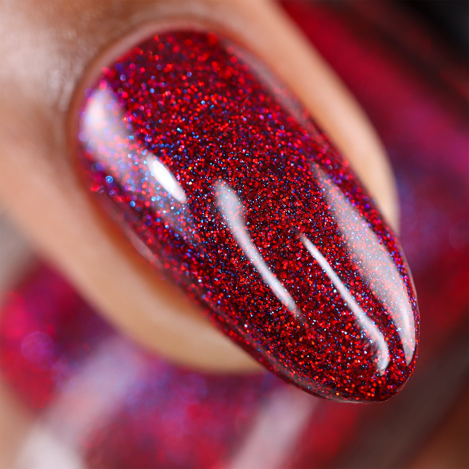 A vampy sangria red jelly base suspends a whisper of bright blue Aurora shimmer and red holographic microglitter.