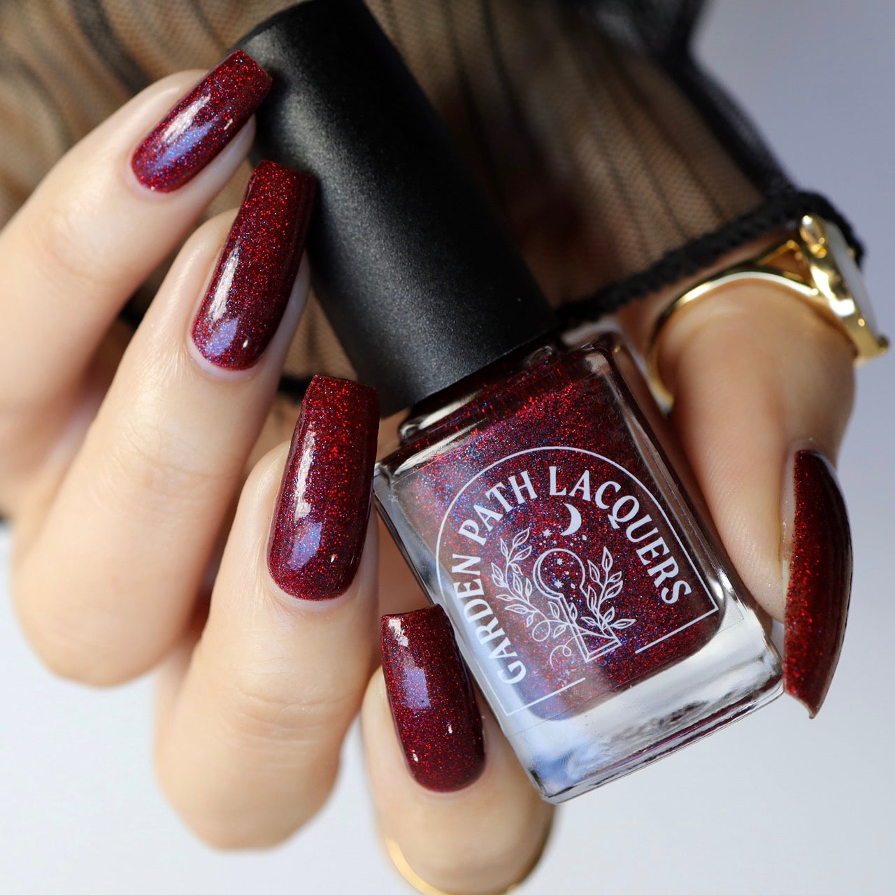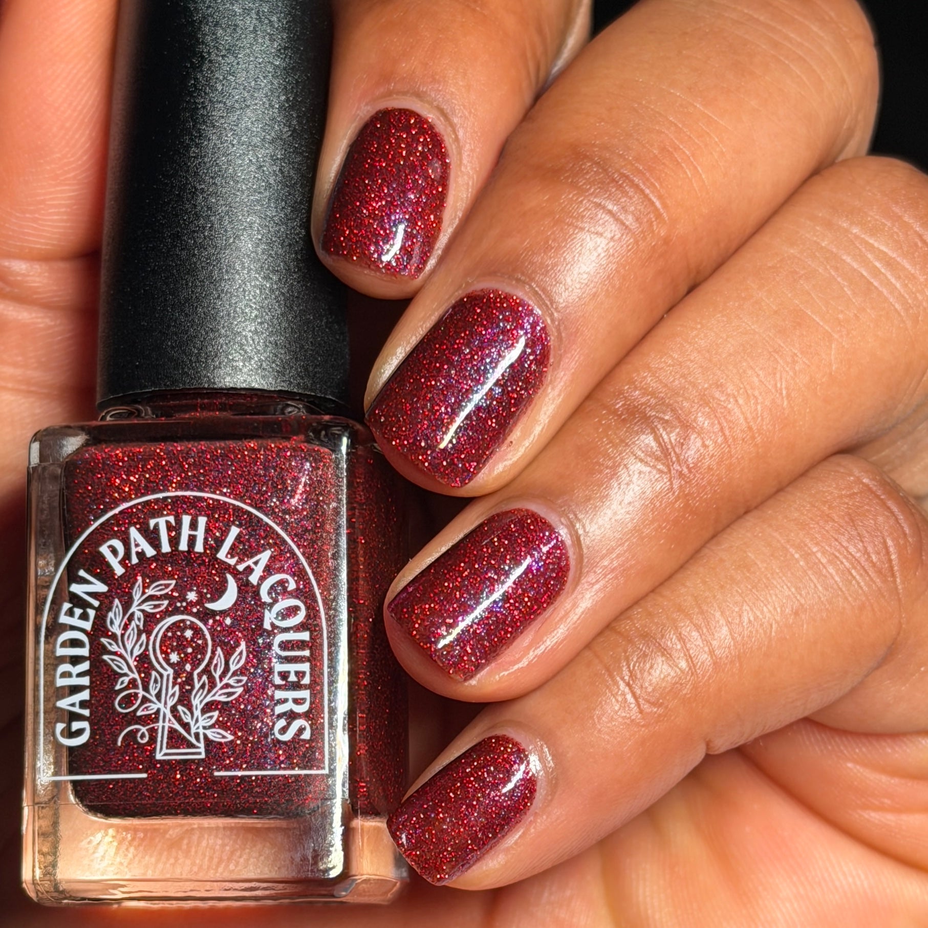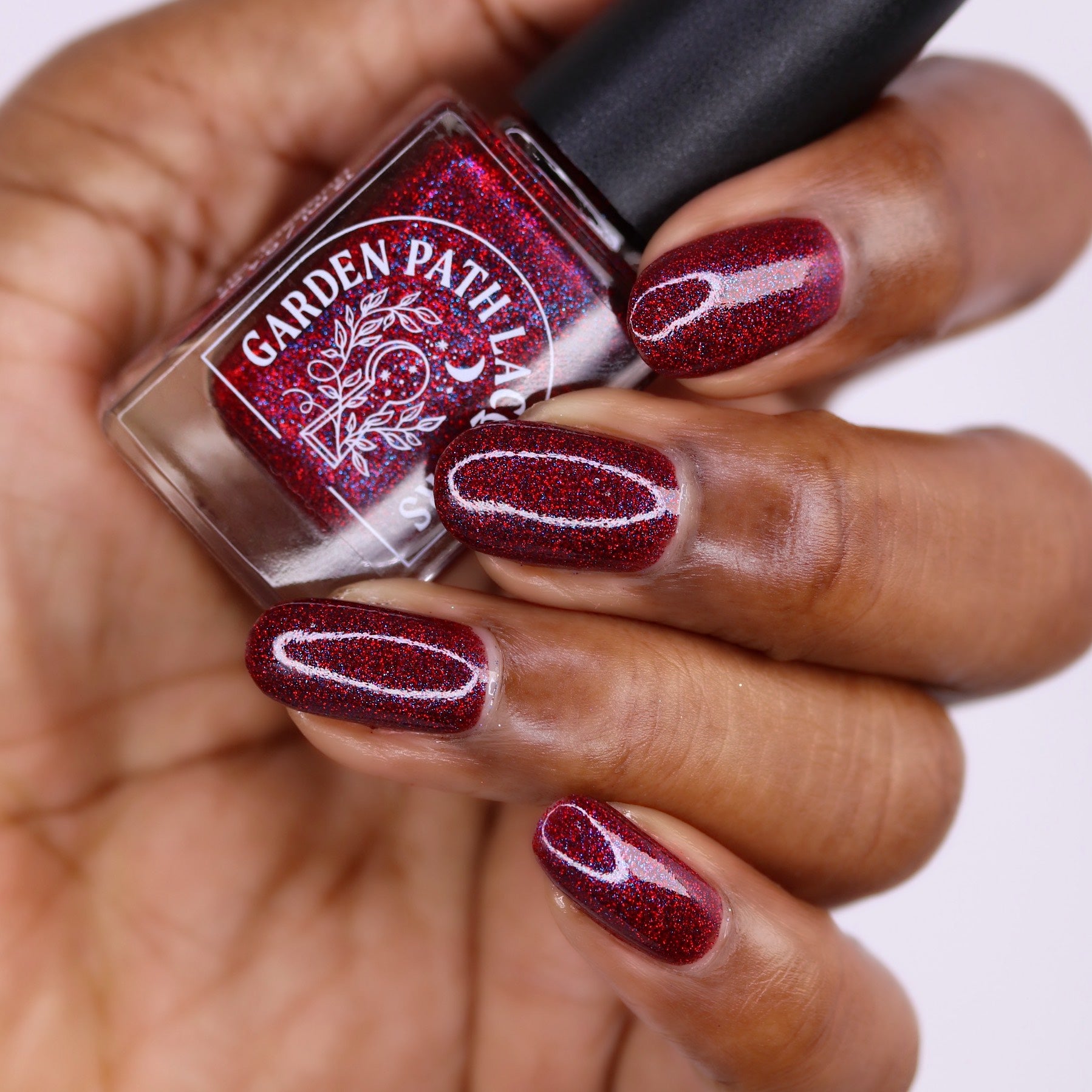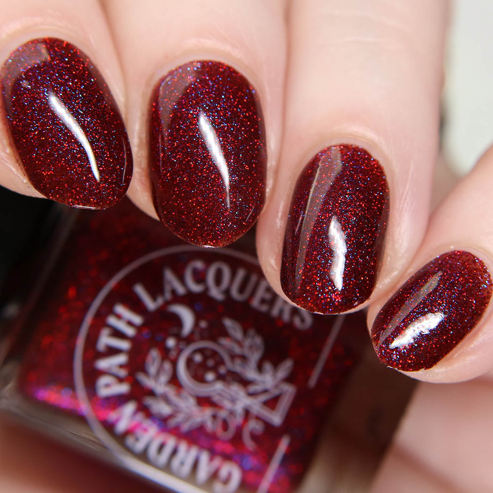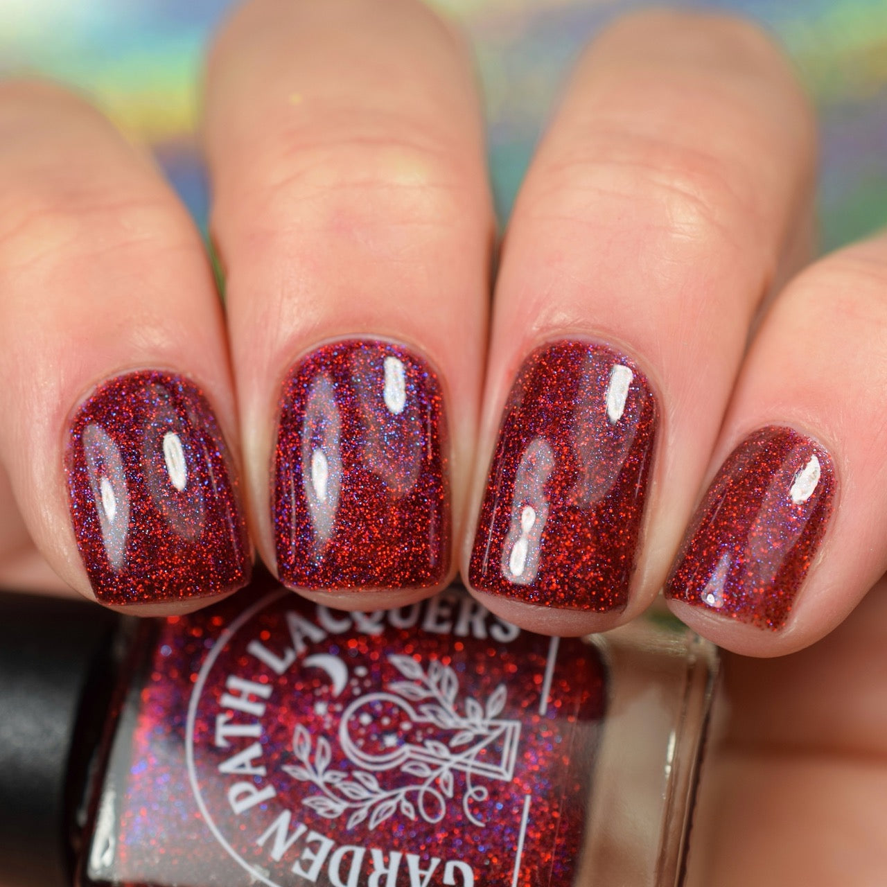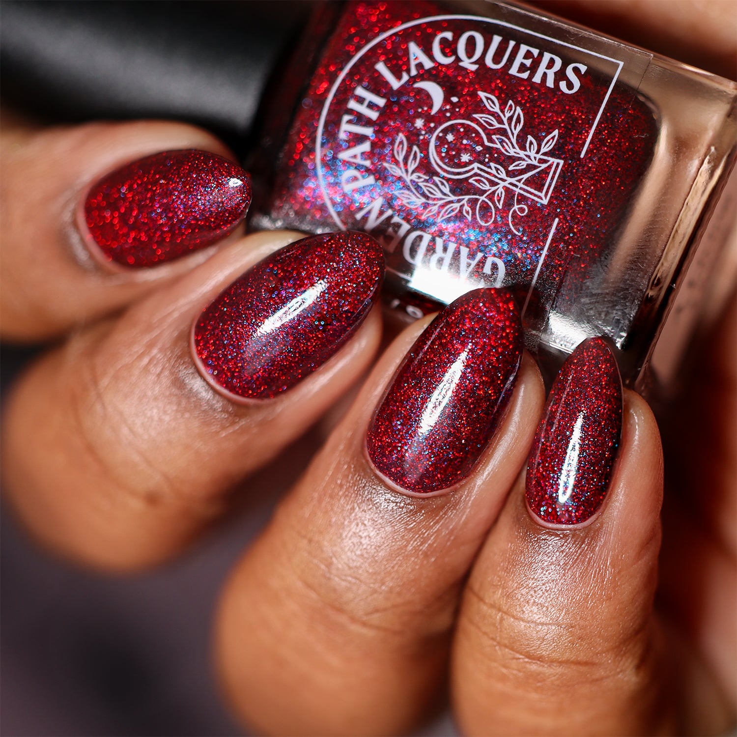 A vampy sangria red jelly base suspends a whisper of bright blue Aurora shimmer and red holographic microglitter.