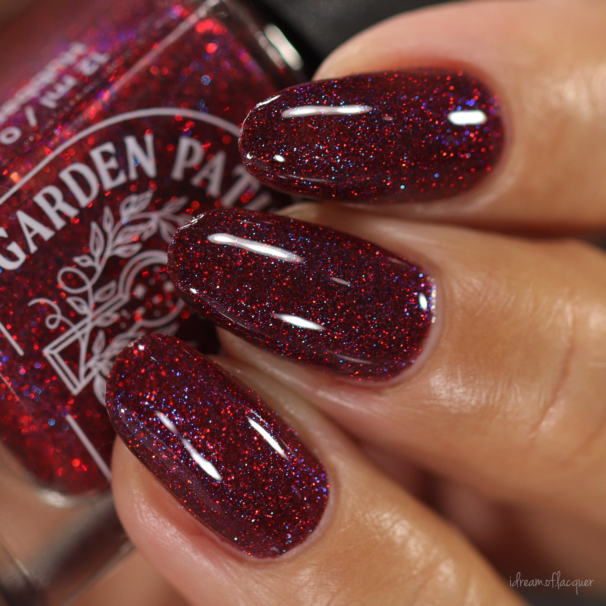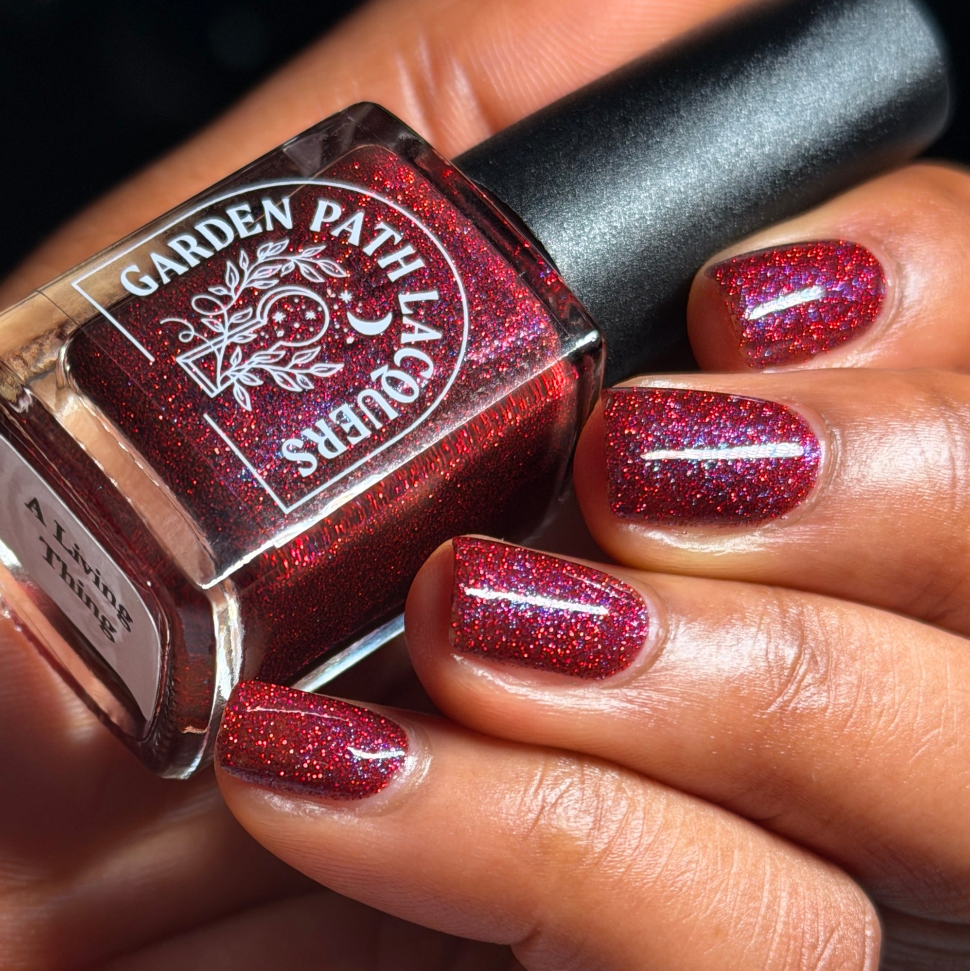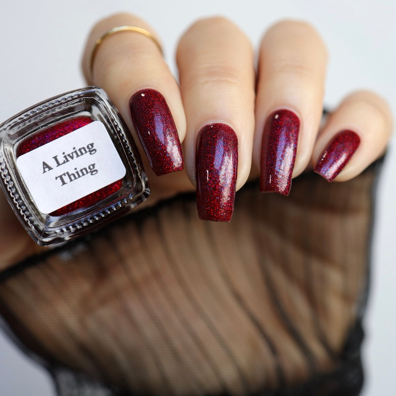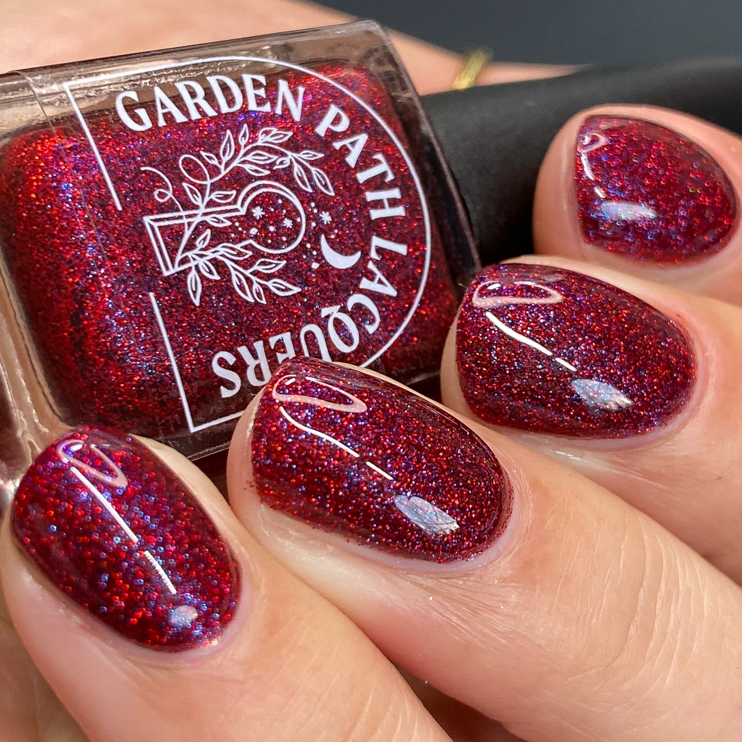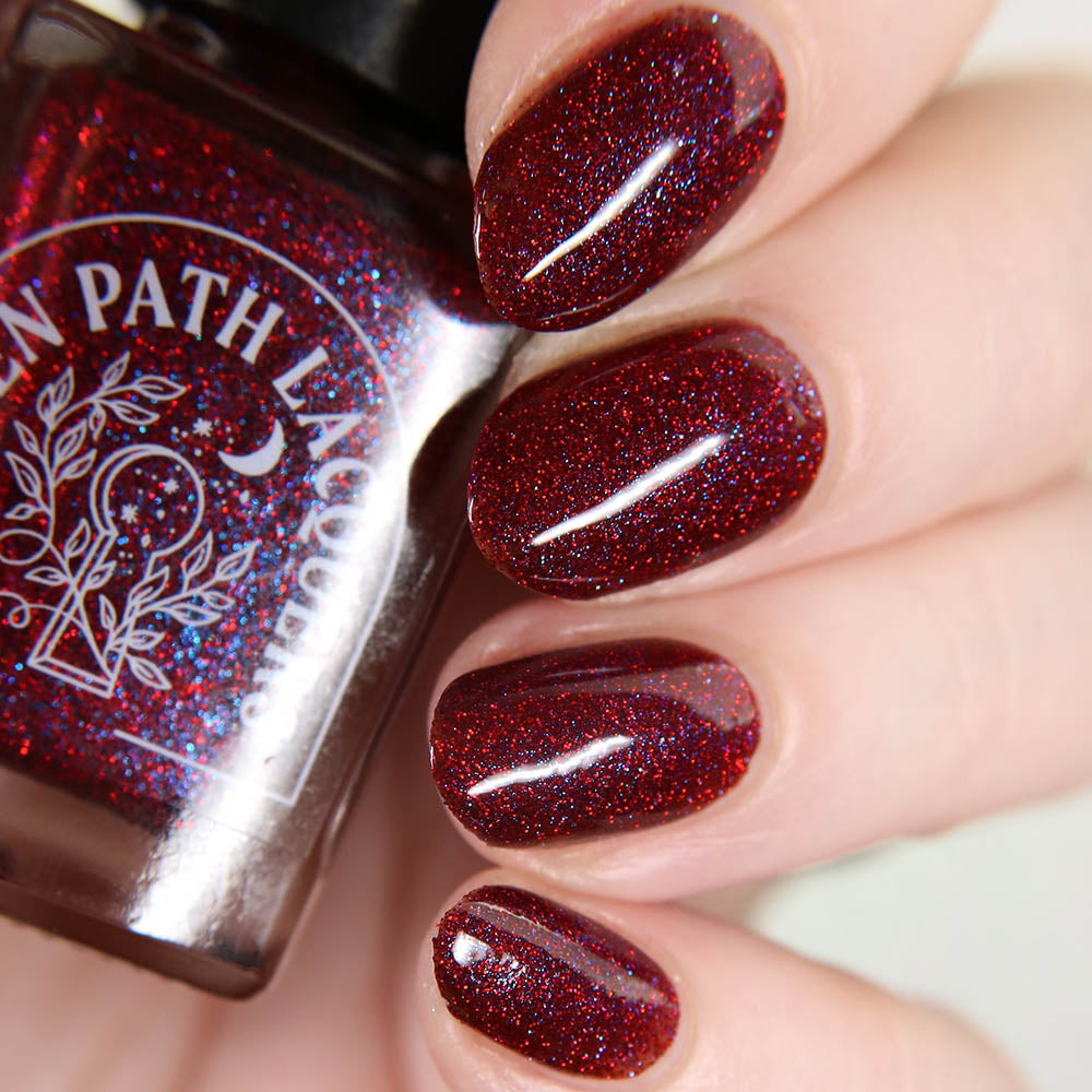 A vampy sangria red jelly base suspends a whisper of bright blue Aurora shimmer and red holographic microglitter.