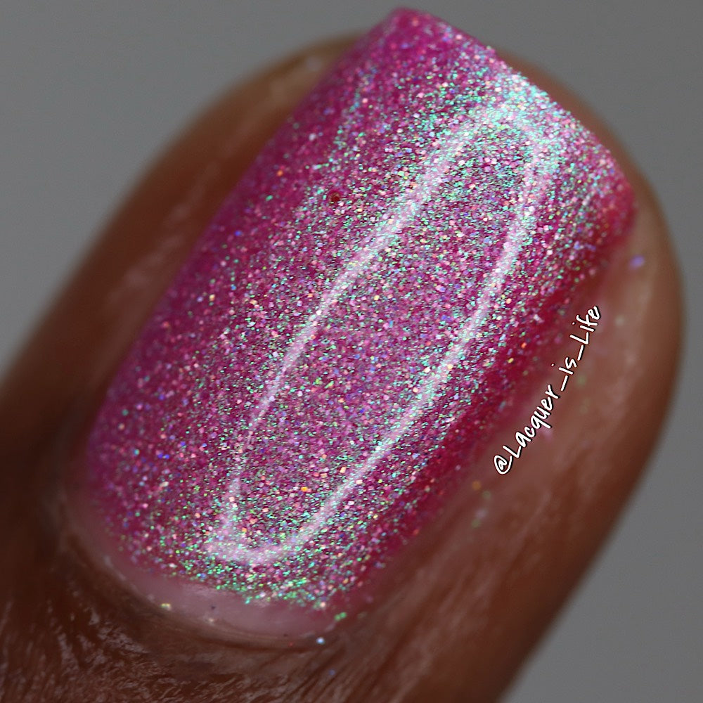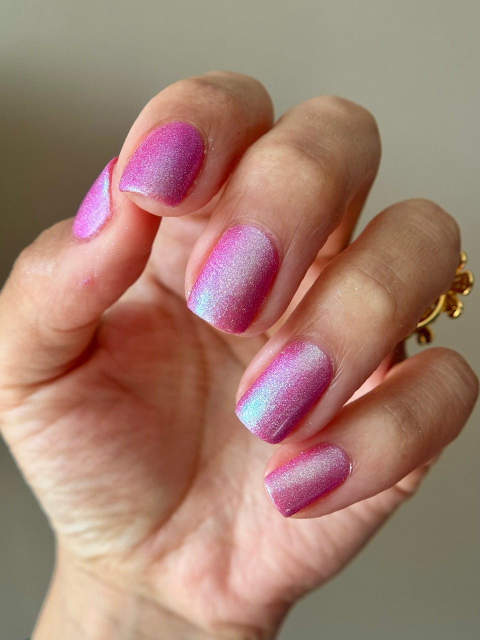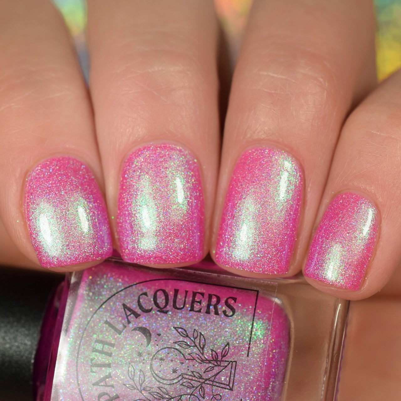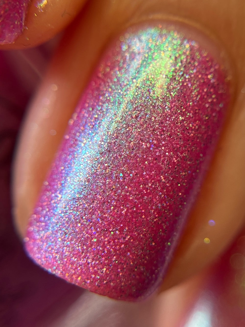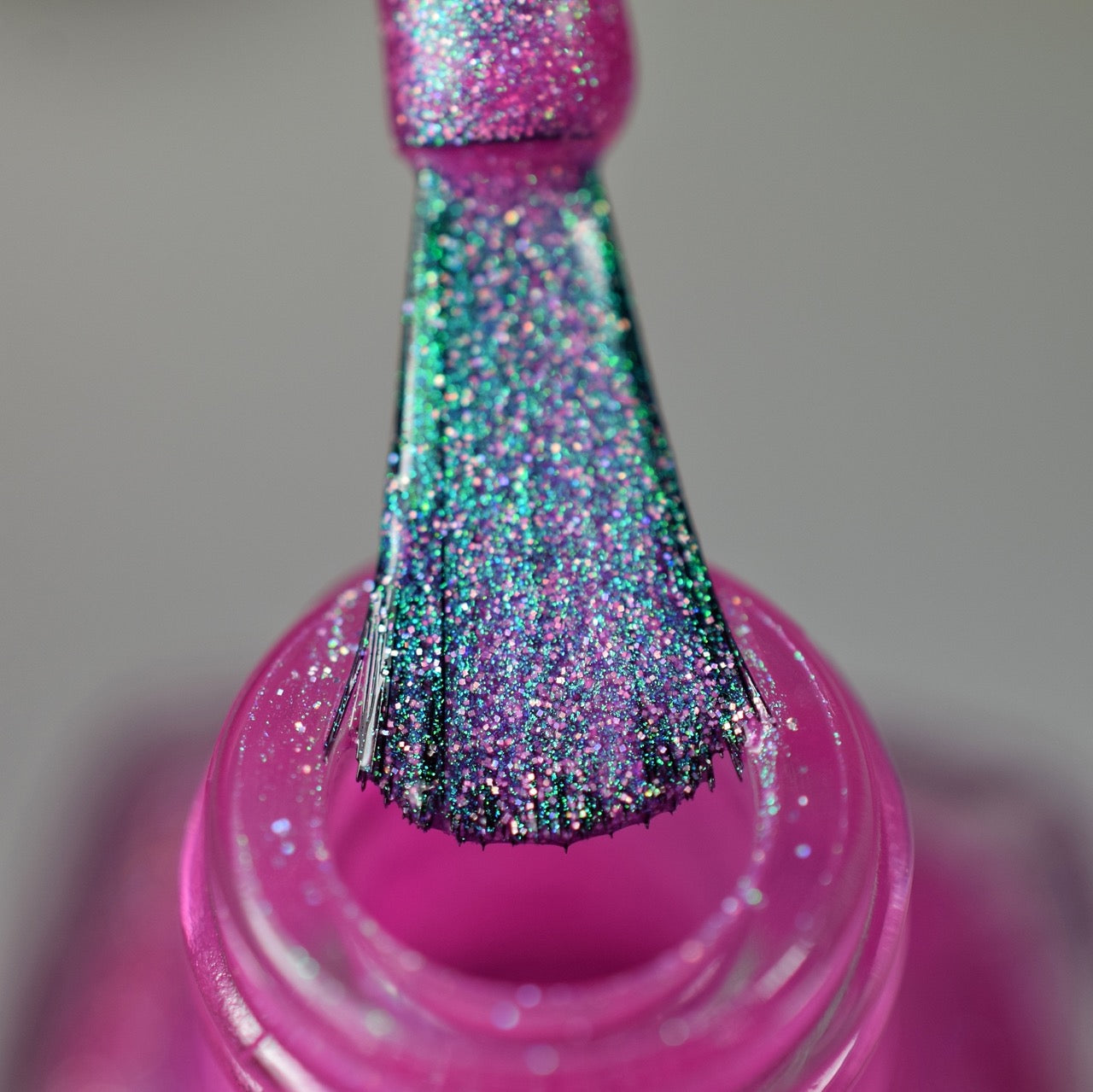This juicy, bubble-gum pink bleached neon crelly is filled with aqua to blue shifting Aurora shimmer and silver holographic microglitters.