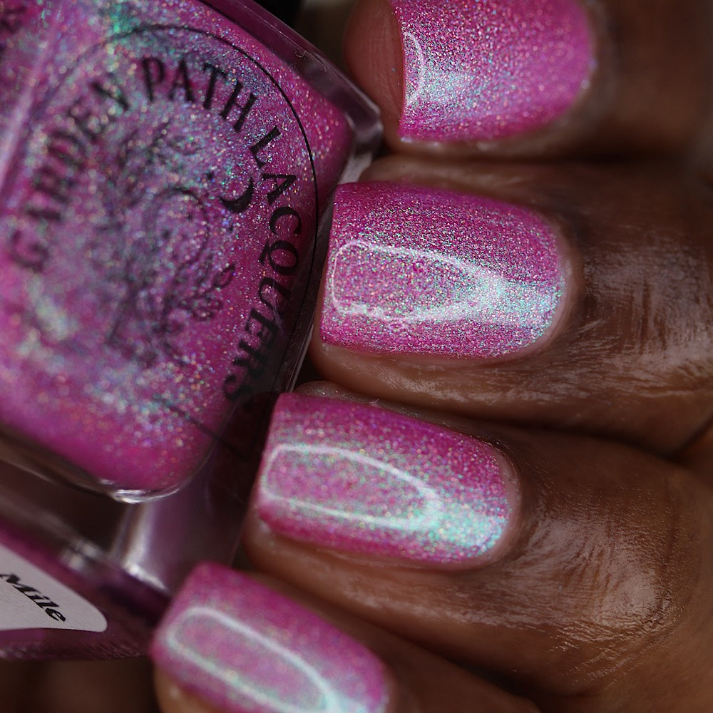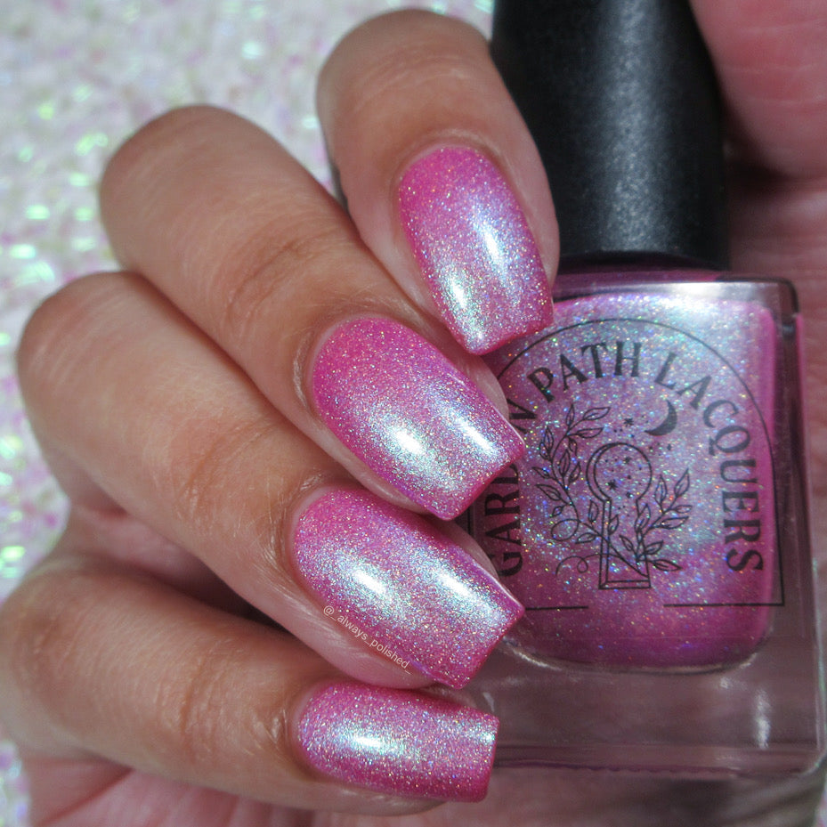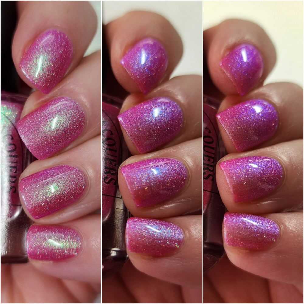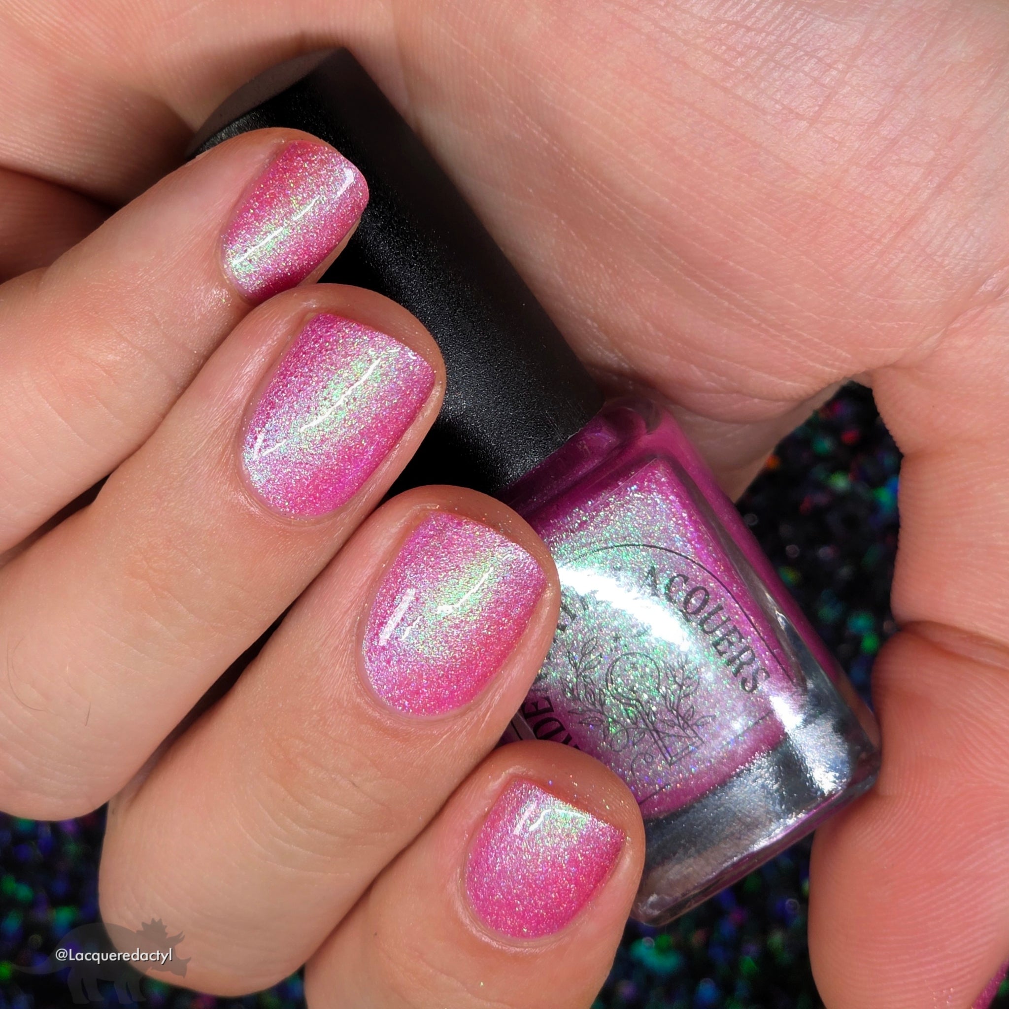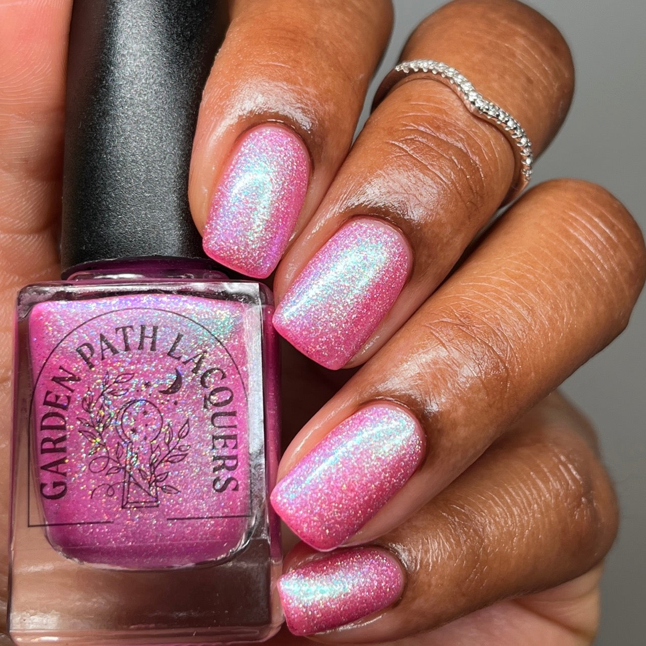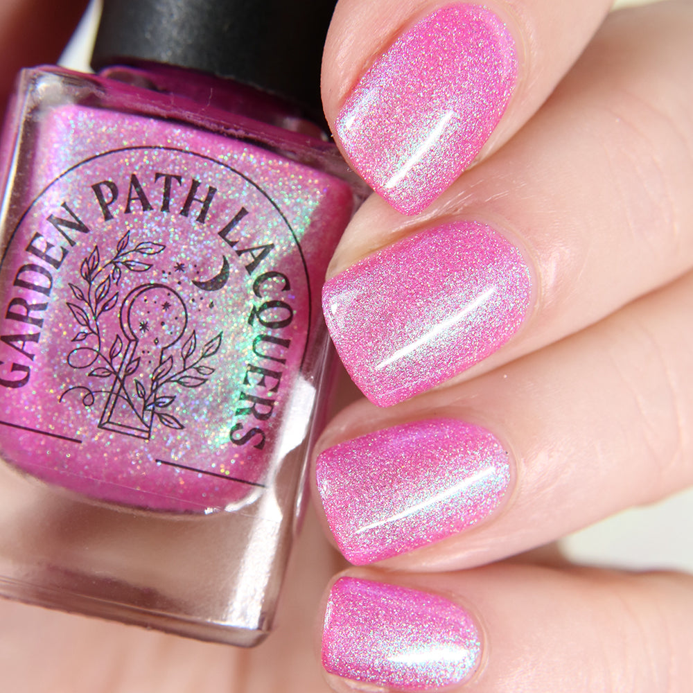 This juicy, bubble-gum pink bleached neon crelly is filled with aqua to blue shifting Aurora shimmer and silver holographic microglitters.