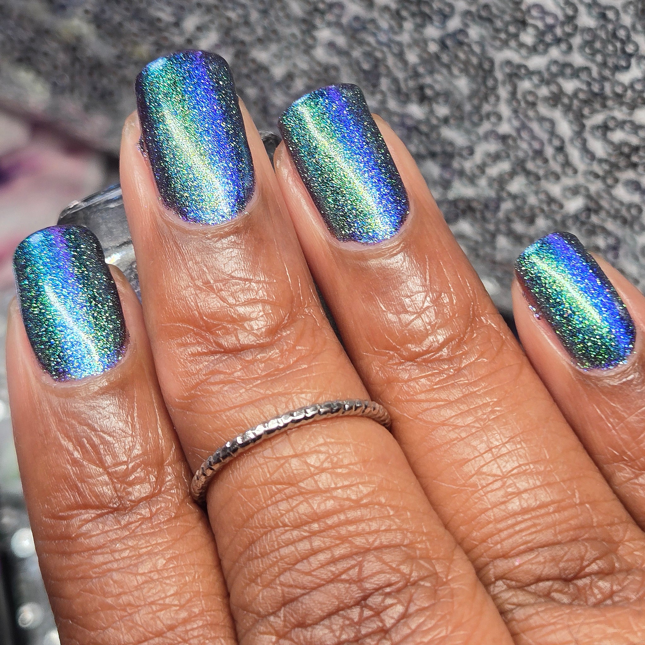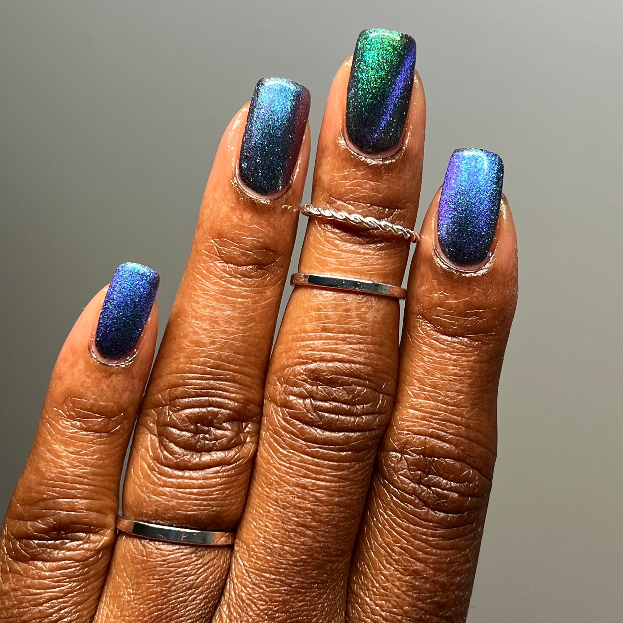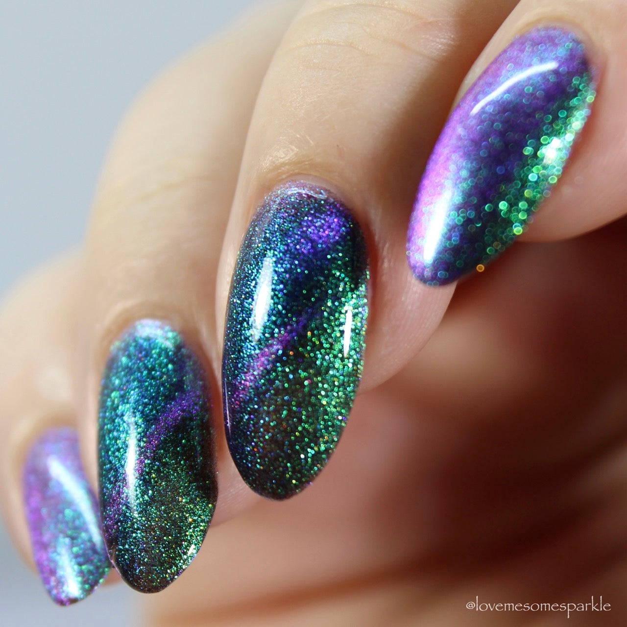 Blue/purple/pink shifting magnetic pigment is accented with green/blue Aurora shimmer.