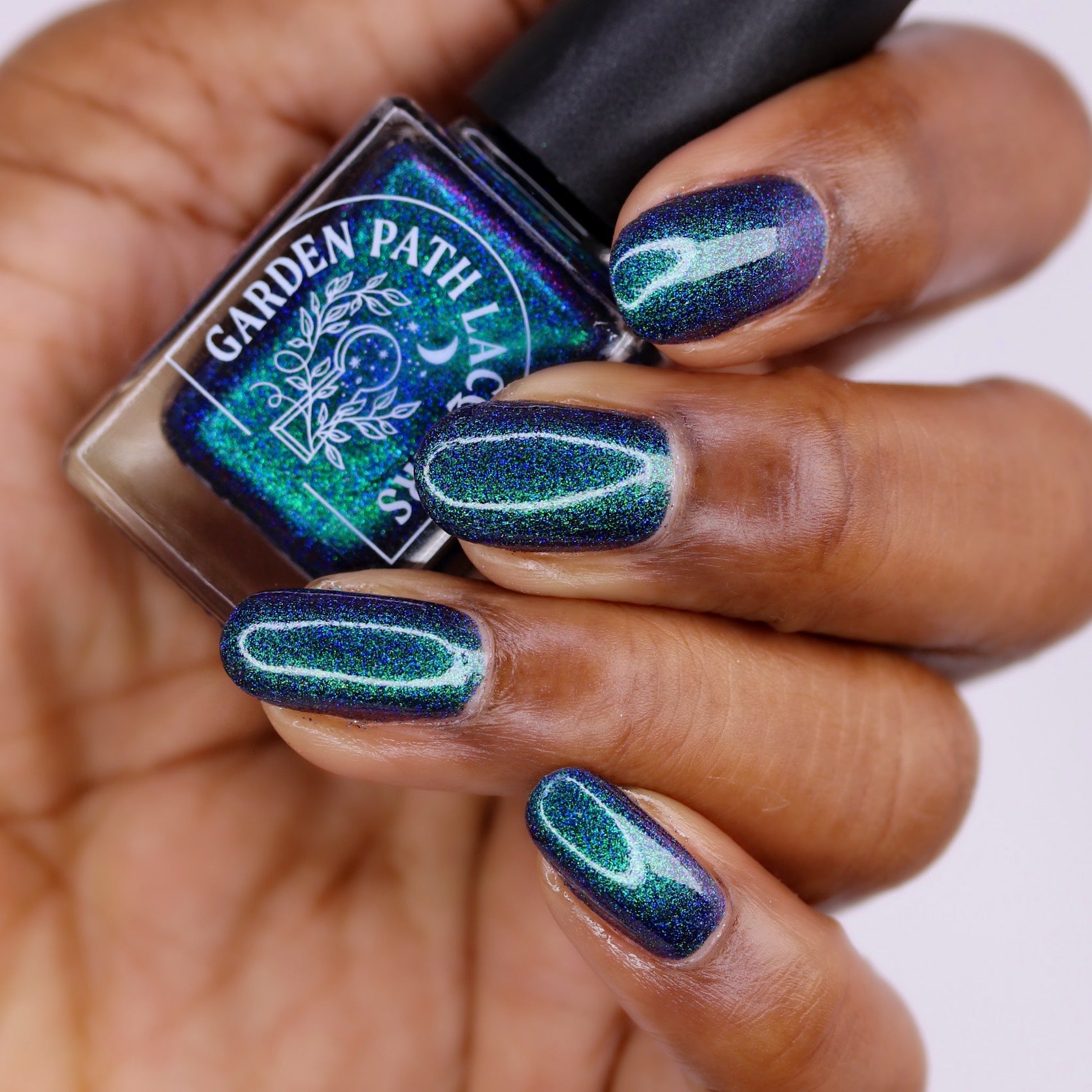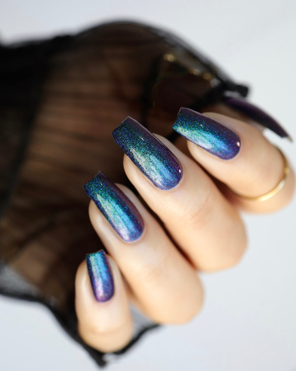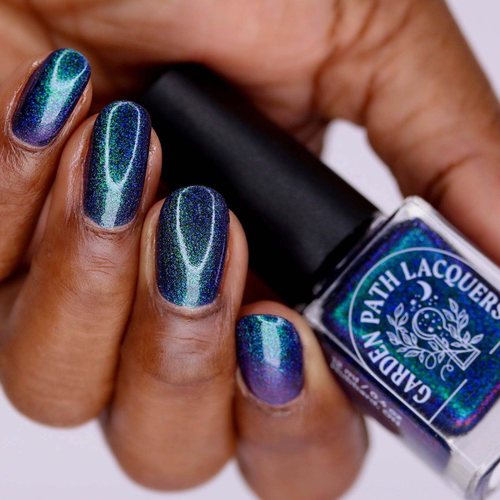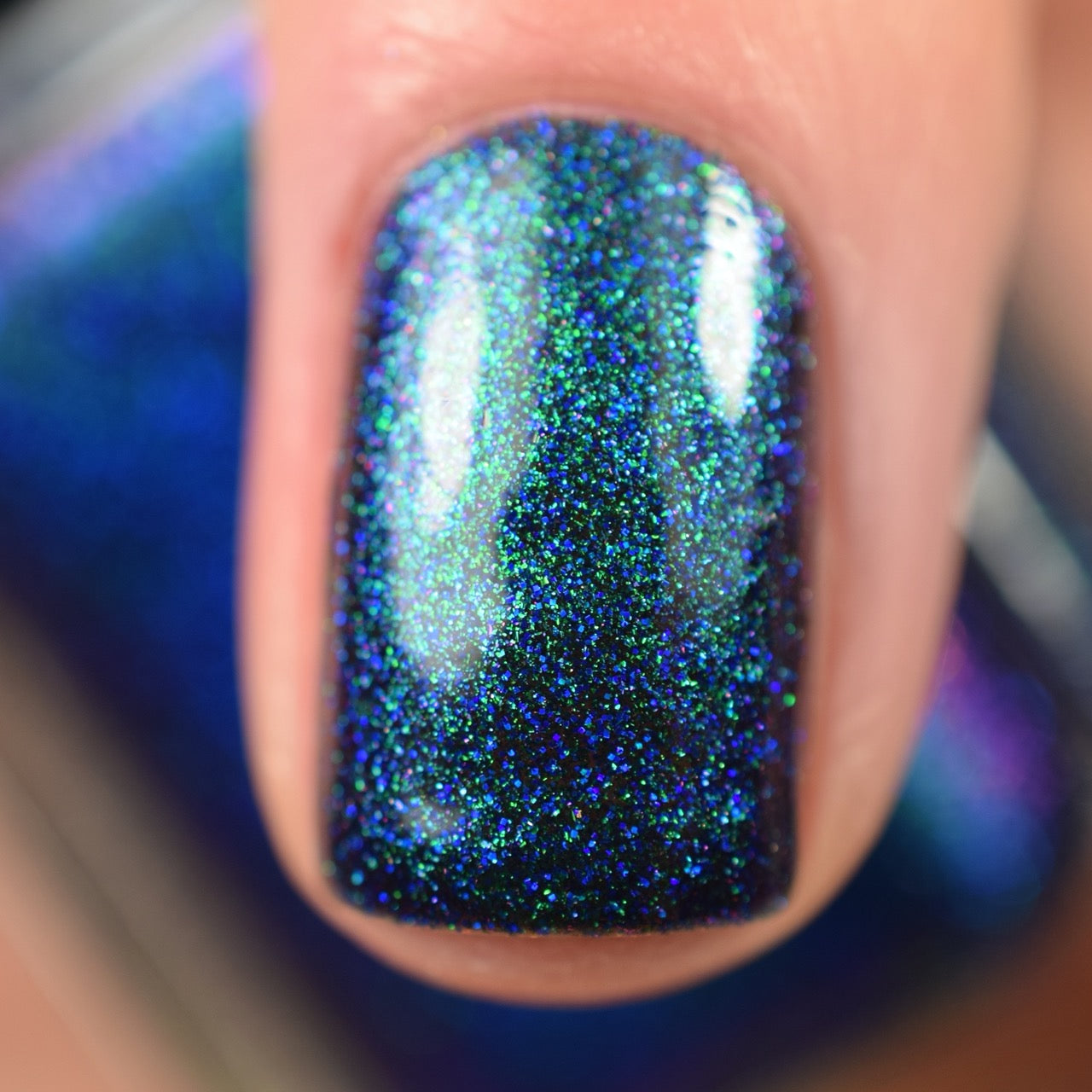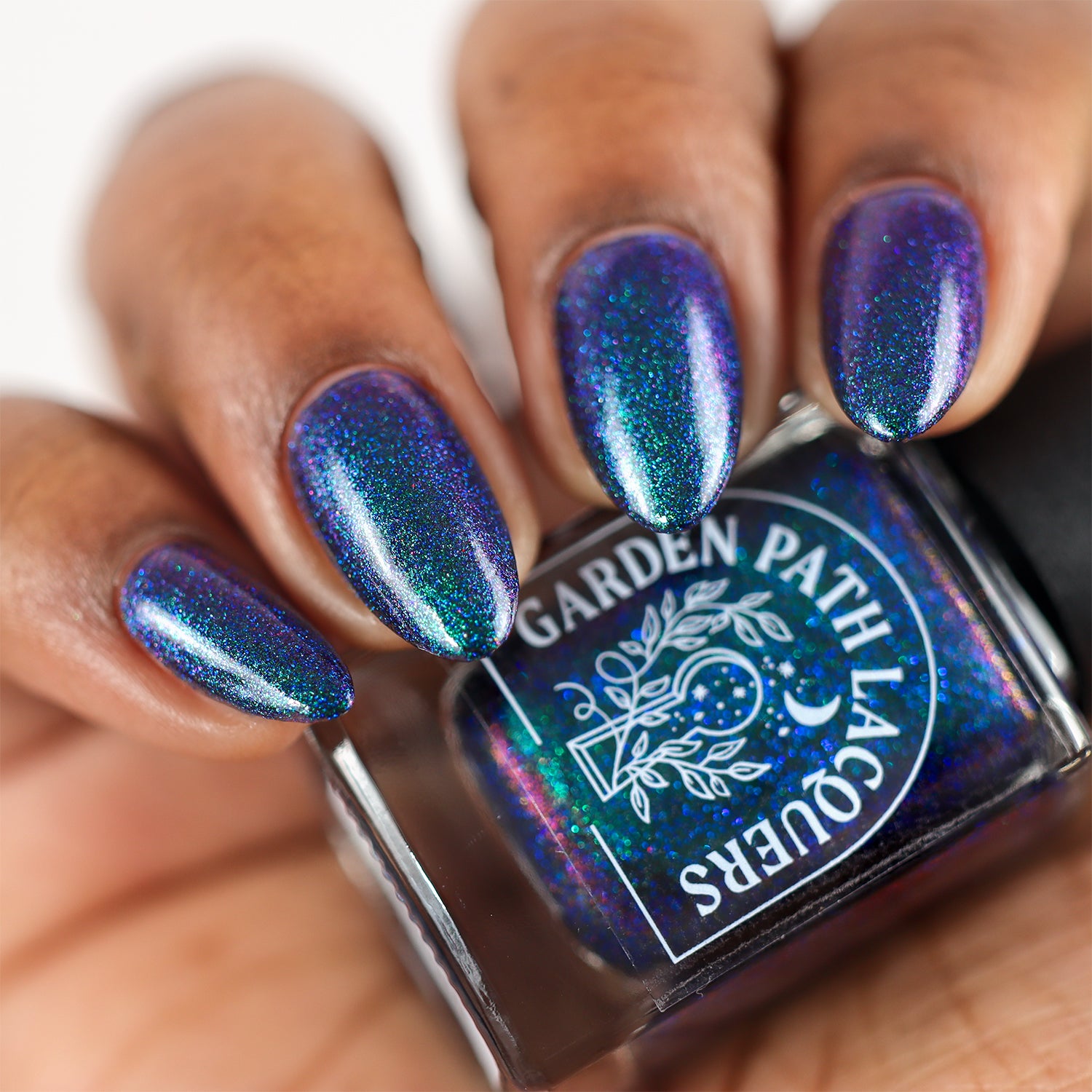 A deep, darkened blue-to-violet shifting multichrome base filled with royal blue holographic microglitter.