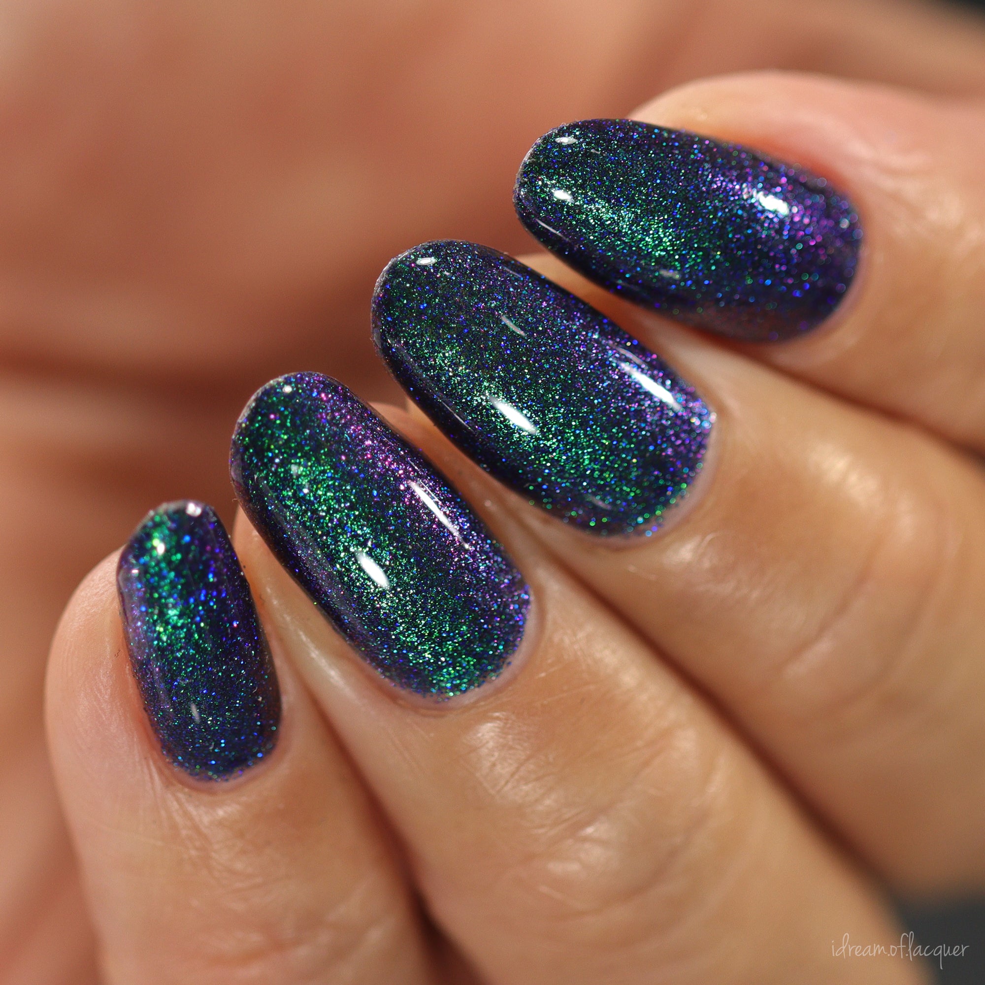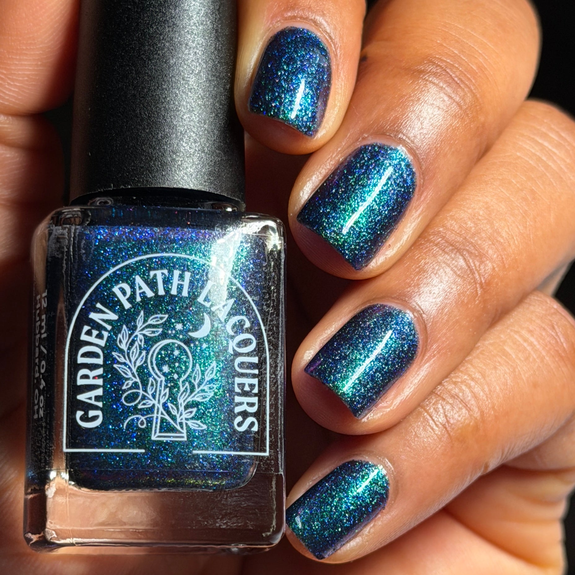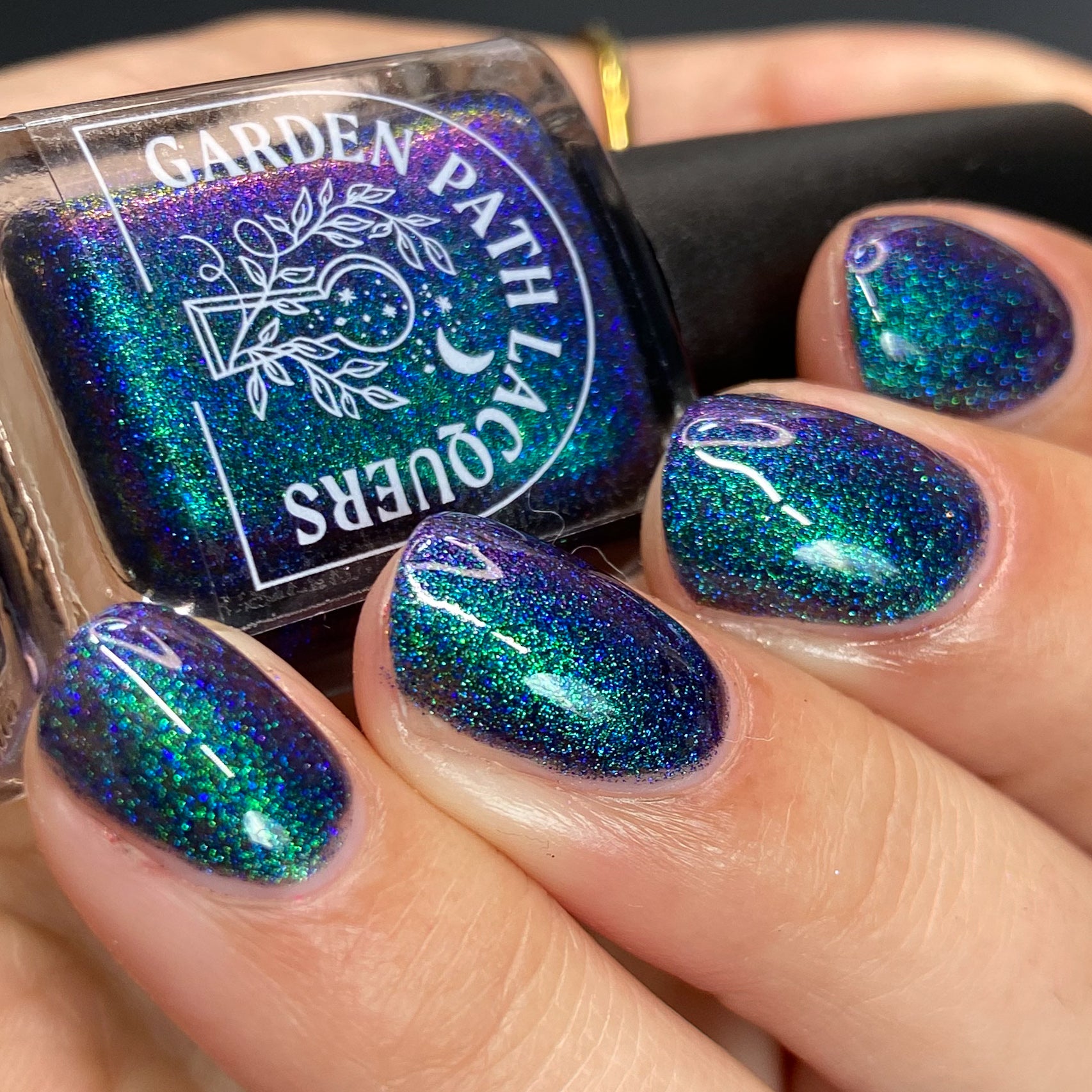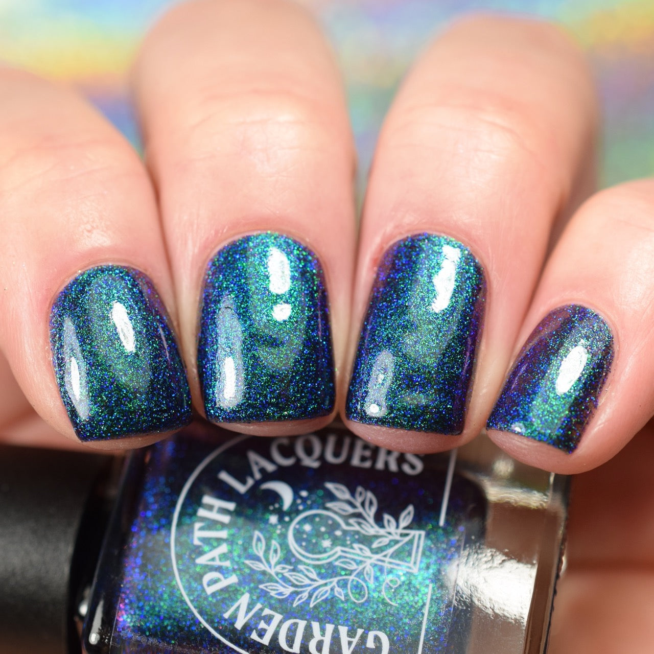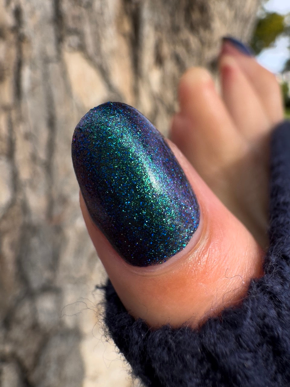 A deep, darkened blue-to-violet shifting multichrome base filled with royal blue holographic microglitter.