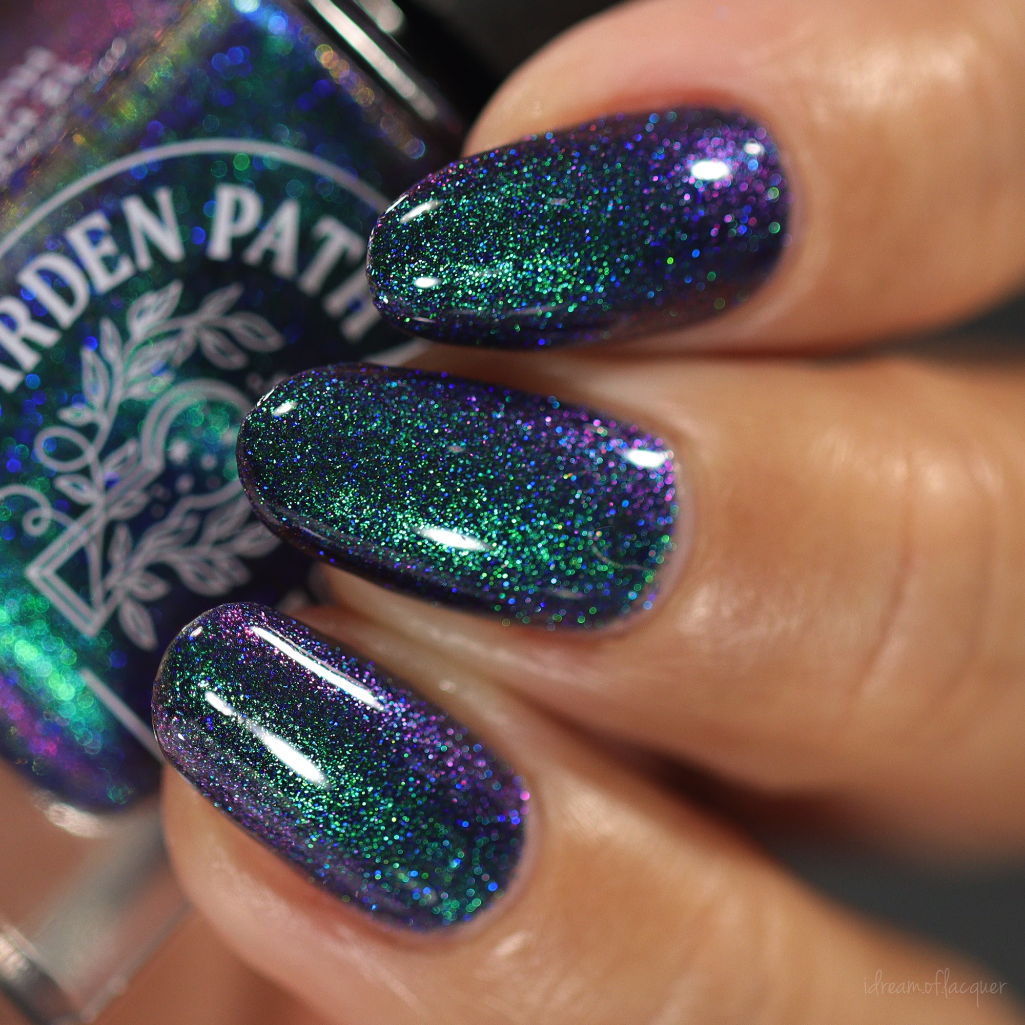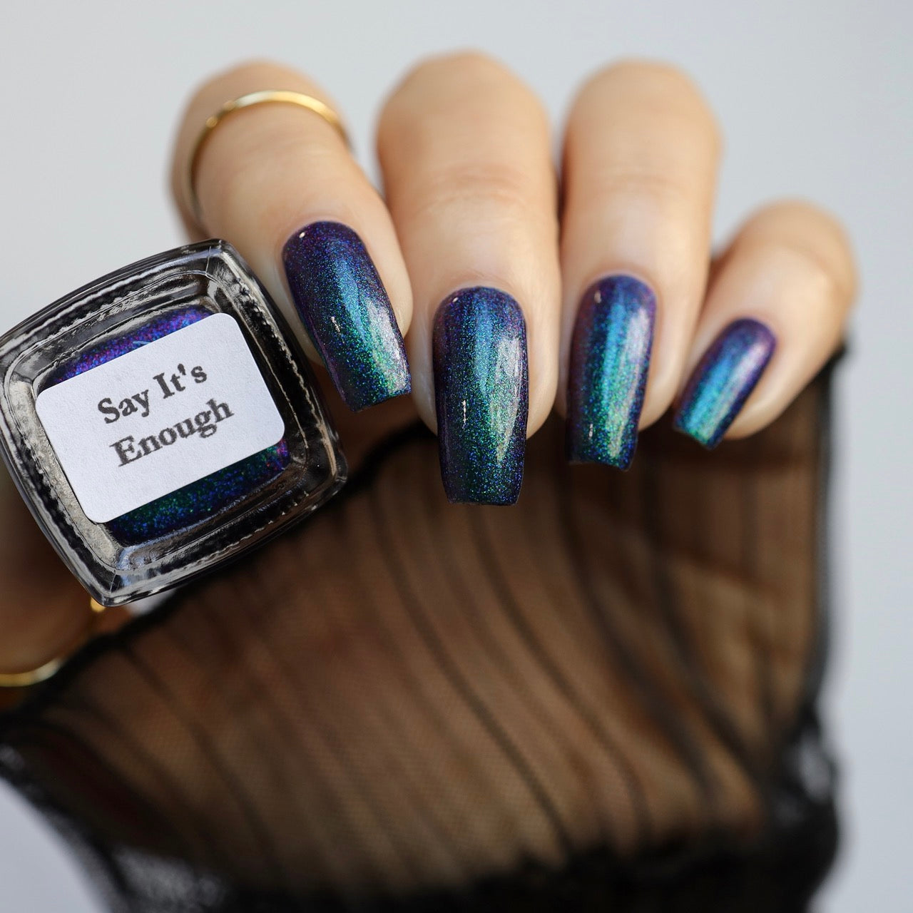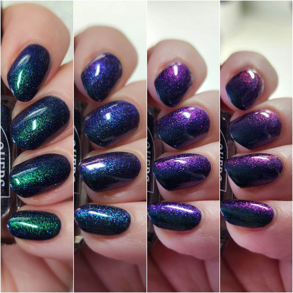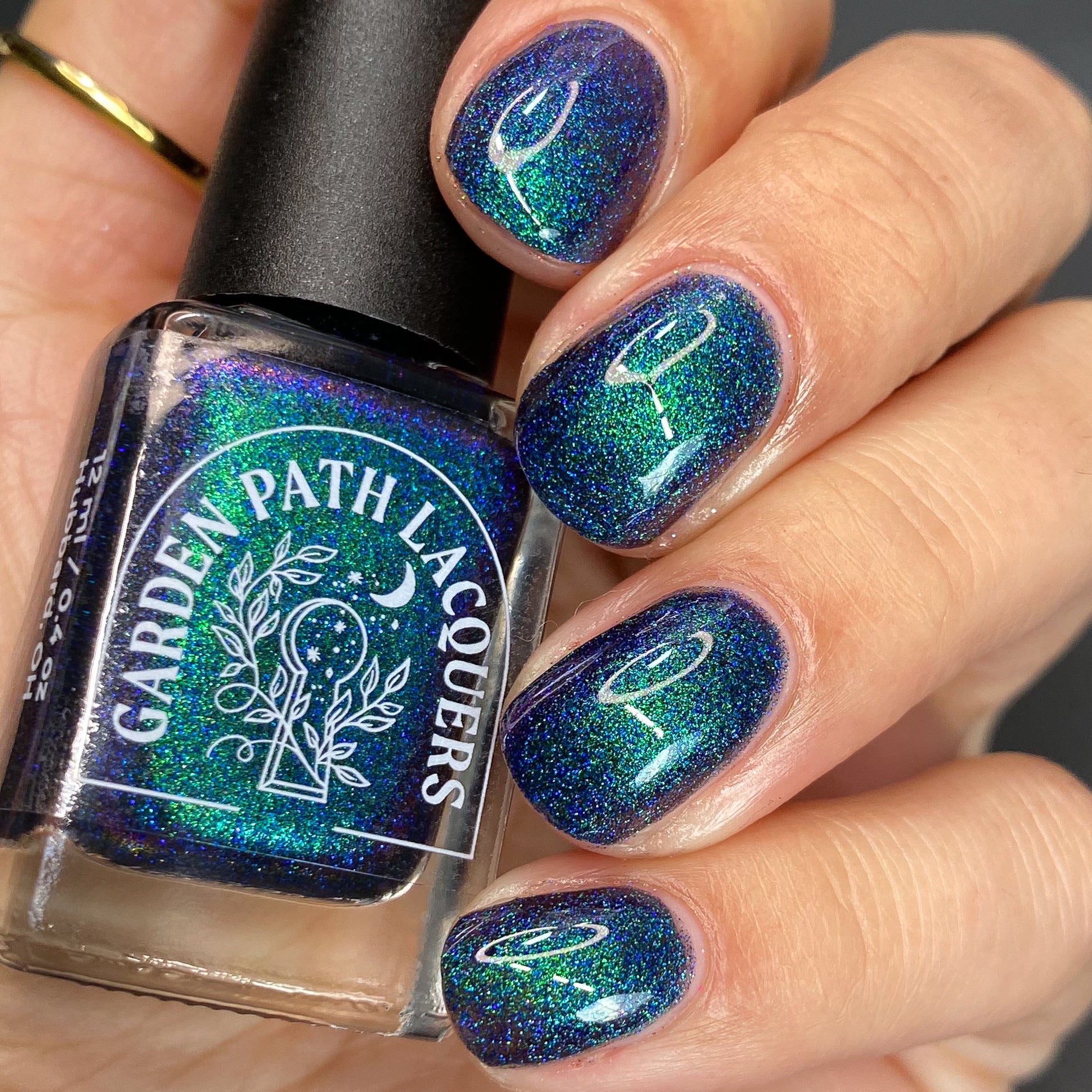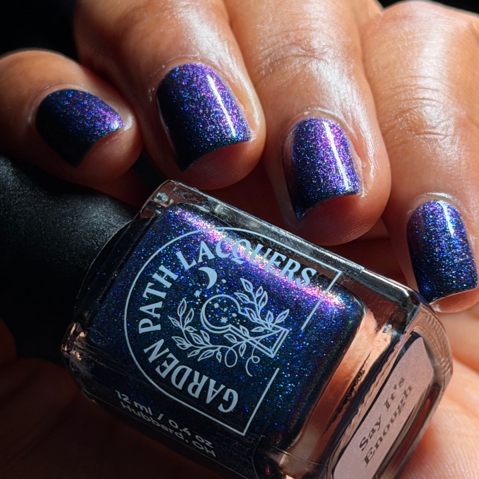A deep, darkened blue-to-violet shifting multichrome base filled with royal blue holographic microglitter.